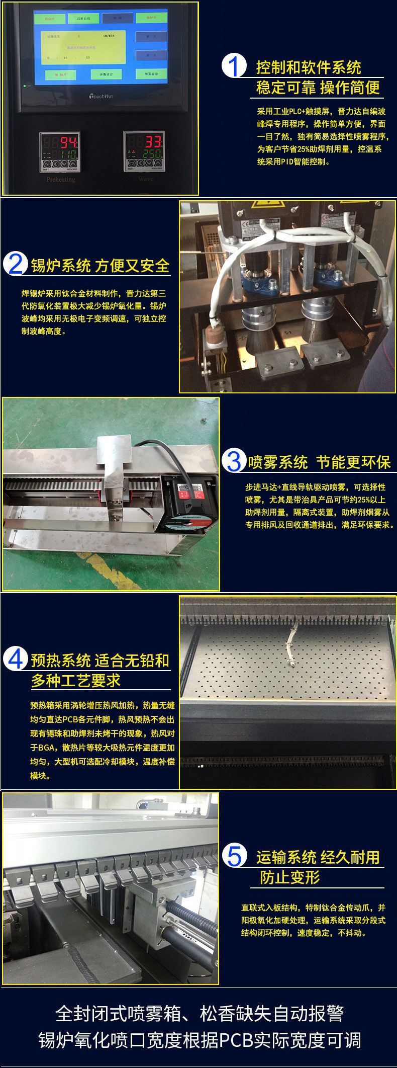 1、智能檢測系統,PCB板進入助焊劑噴霧區和錫爐焊接區,自動開始噴霧和焊接,完畢后自動停止,為客戶減少25%電能和助焊劑,錫條的用量