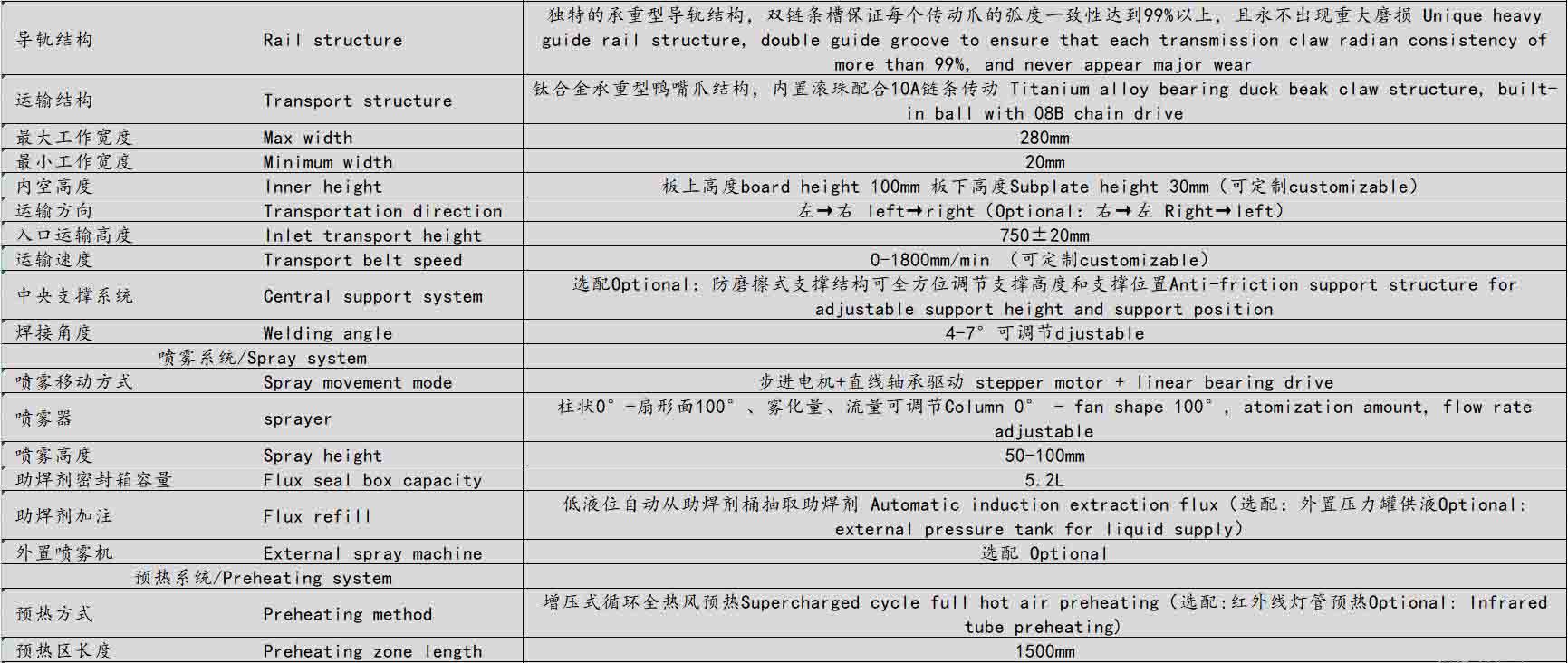● 獨(dú)特的承重型導(dǎo)軌結(jié)構(gòu),滾珠鏈條配合上下雙導(dǎo)槽保證每個傳動爪的弧度一致性達(dá)到99%以上,可滿足高要求、重型產(chǎn)品、治具的過爐要求,運(yùn)輸時元器件無抖動,可承重100KG不變形不磨損