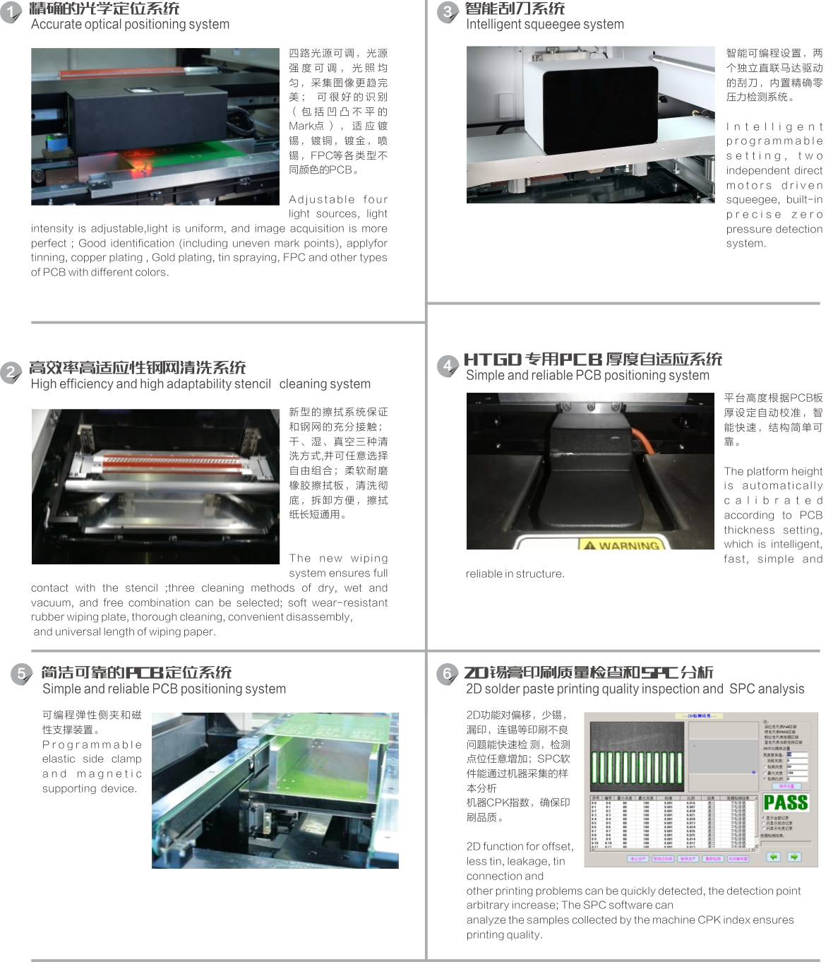 ● 高分辨率的視覺處理,高精度的傳動系統,懸浮式自適應刮刀,精確的板定位處理,靈巧的網框夾緊結構,兼具準確和高靈活性,除了提供高效,精確的印刷功能外,更為客戶提供突出的高性價比