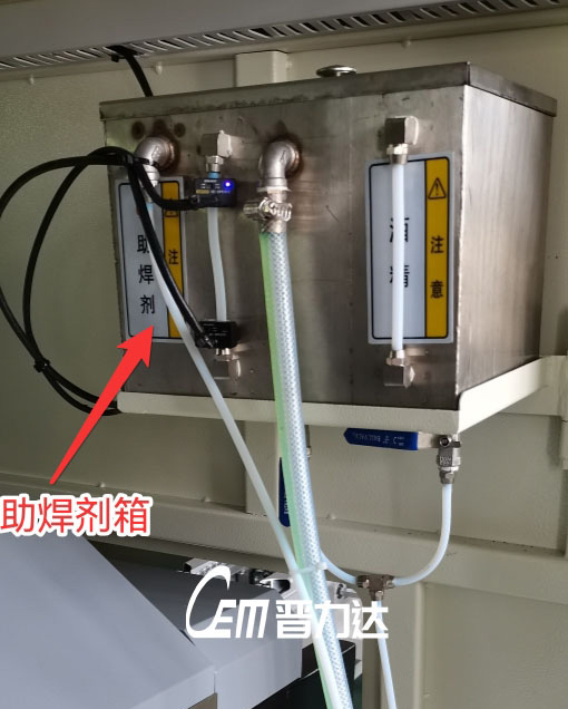 水箱采用316不銹鋼制作,利用水箱的高水位往噴嘴的低水位供給助焊劑,這種是市面上大部分波峰焊采用的標準助焊劑供給方式,能基本滿足 PCB 焊接工藝要求,其成本低,維護方便,而對于部分產品焊盤透錫至板面要求較為嚴格的產品不太實用,其缺點是噴霧受水壓影響,整體的噴霧均勻性低于壓力罐供液,且水箱內助焊劑液位低時水壓低,由于壓力不夠會導致噴霧可能出現斷續噴霧或者不噴,并且水箱的上蓋密封性沒法和完全焊接密封的壓力罐相比較,箱體與箱蓋有縫隙會導致助焊劑揮發,影響助焊劑成分,所以采用水箱供液盡量1天內用完箱內的助焊劑,多余沒有用完的倒入專門盛放的密封容器內明日再次使用,不要倒回助焊劑原裝桶內。