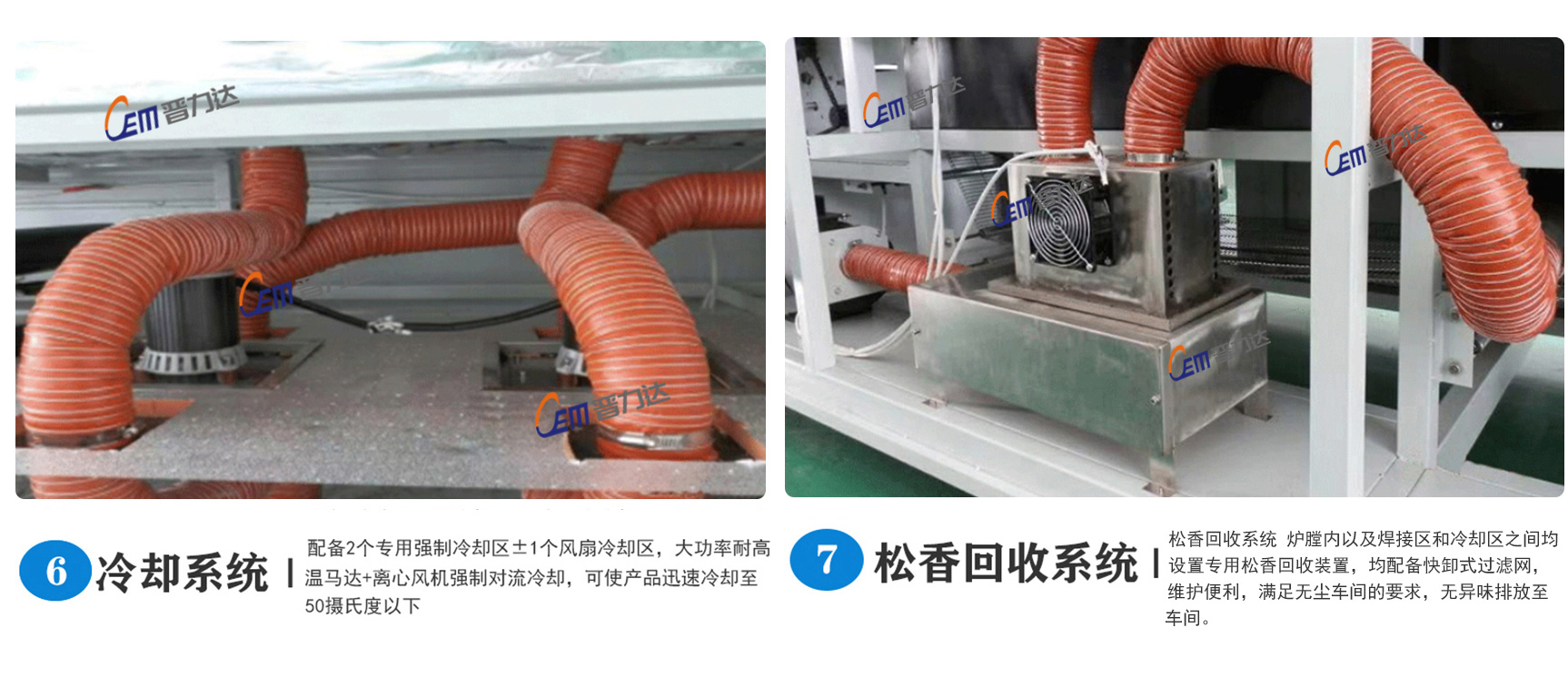 ● 獨立控制的冷卻系統,兩區強制常風/外置冷水機冷卻可選,進口不銹鋼制作,上下冷卻對流,冷卻后的曲線與焊接溫度曲線成鏡像,完全符合SMT國際認證標準